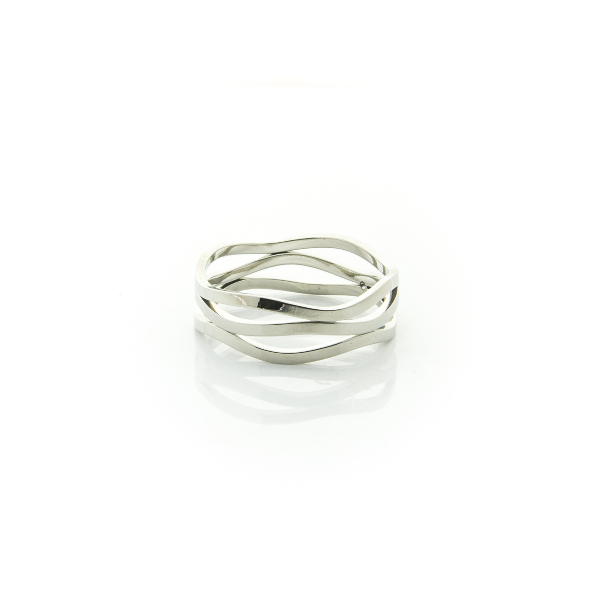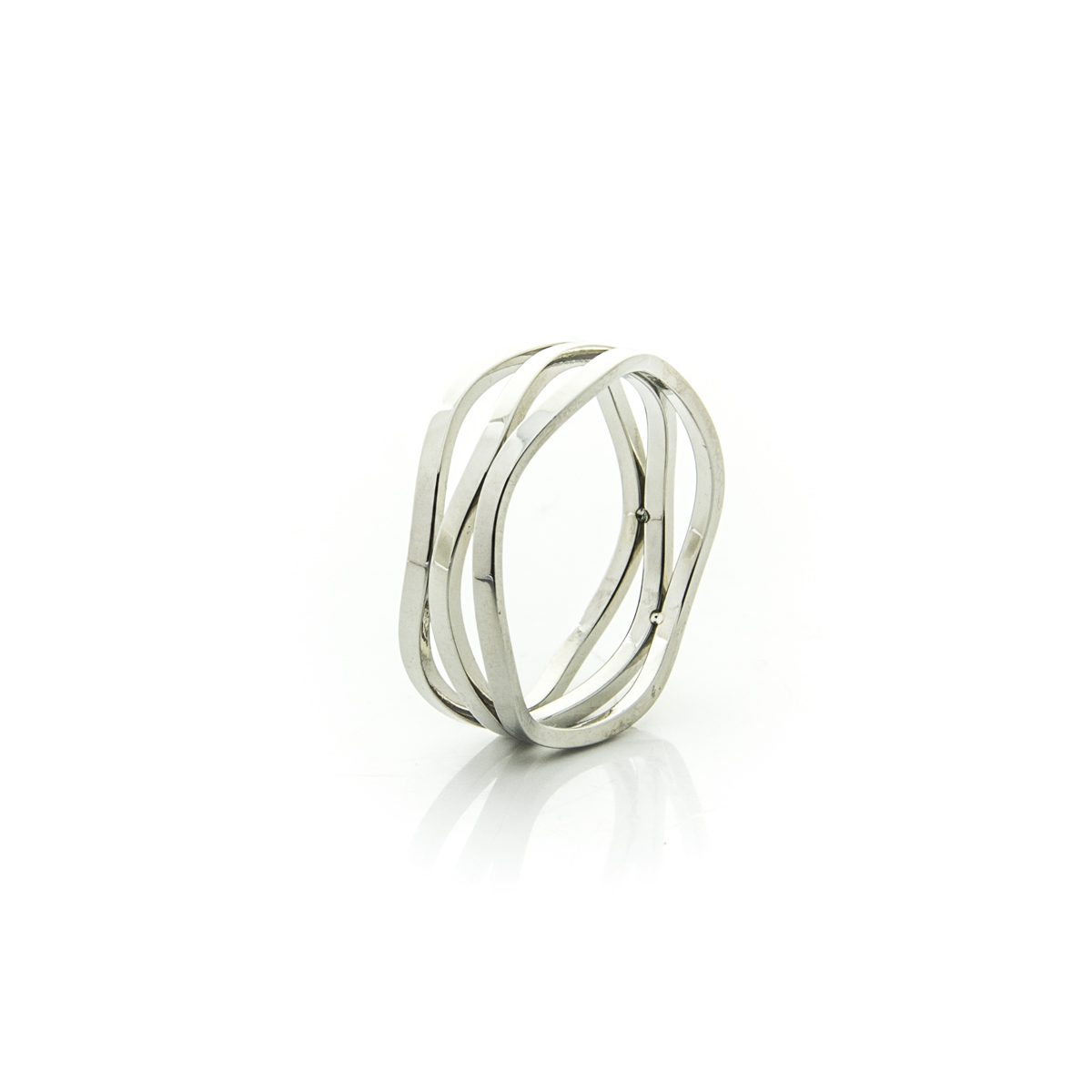 Anillo de acero irregular de color plateado.