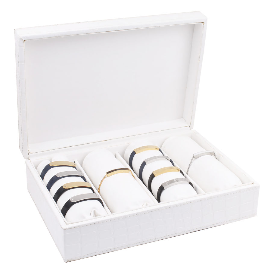 Packaging Blaque de PU en color blanco; 4 separaciones para exhibir pulseras.