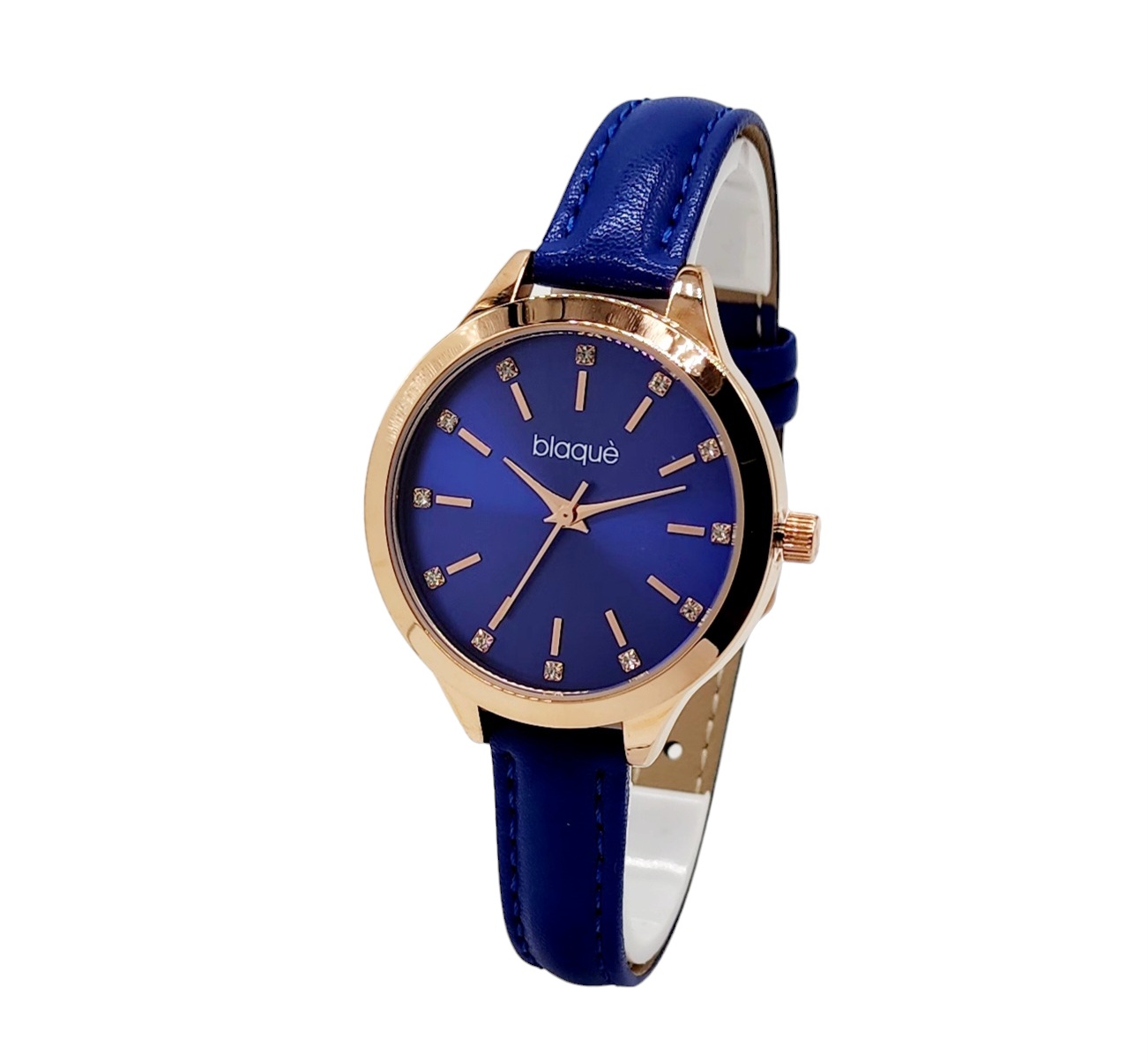 Reloj análogo con caja de metal y malla de cuero.