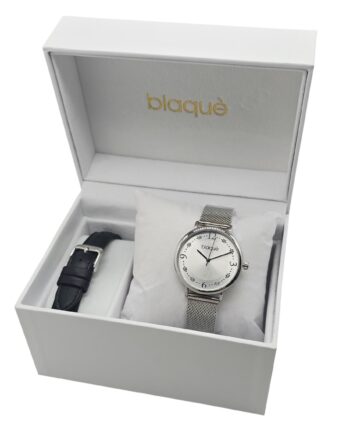 Set reloj análogo con malla intercambiable.