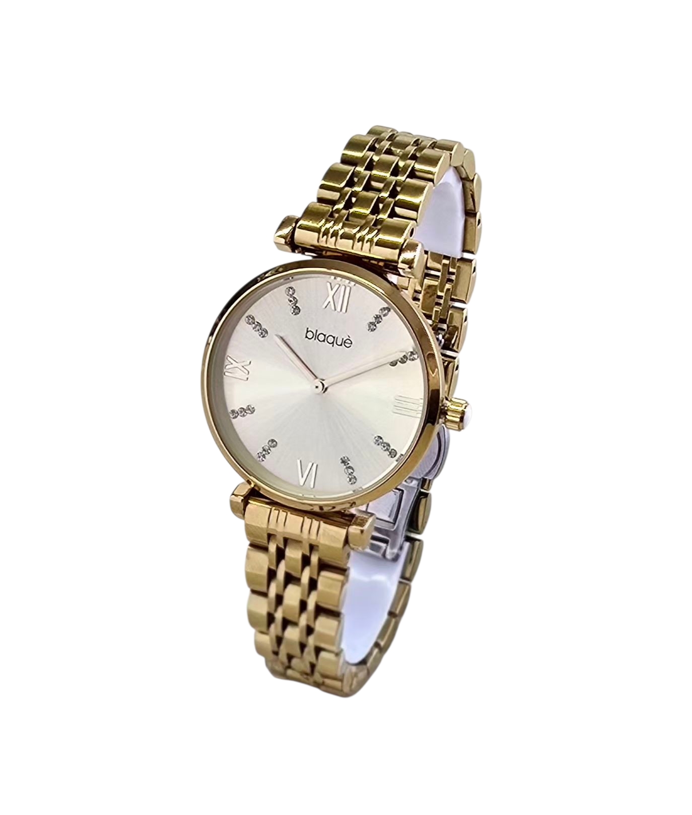 Reloj análogo con caja y malla de metal.