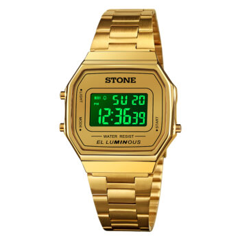 Reloj digital caja y malla de metal.