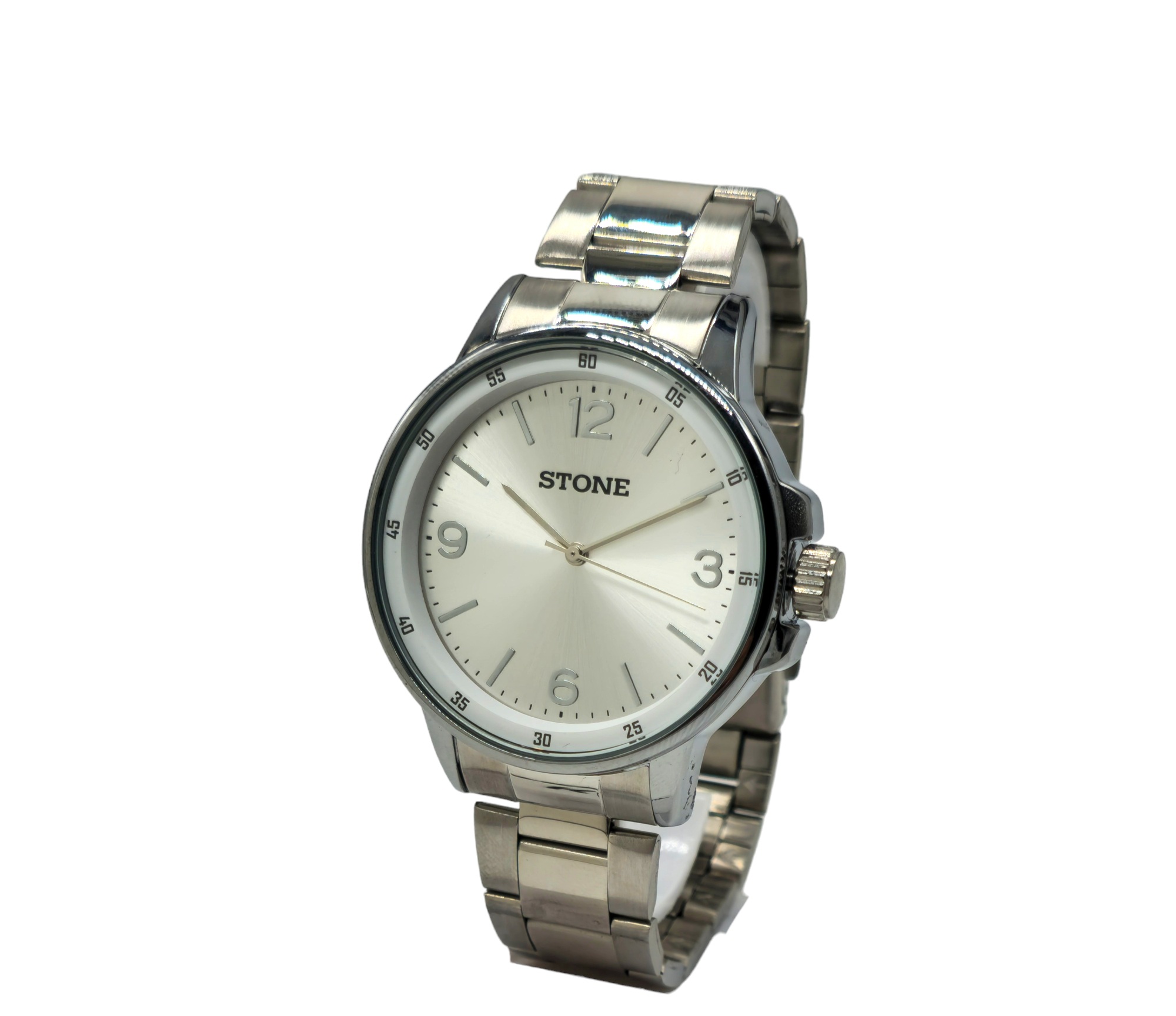 Reloj análogo con caja y malla de metal.