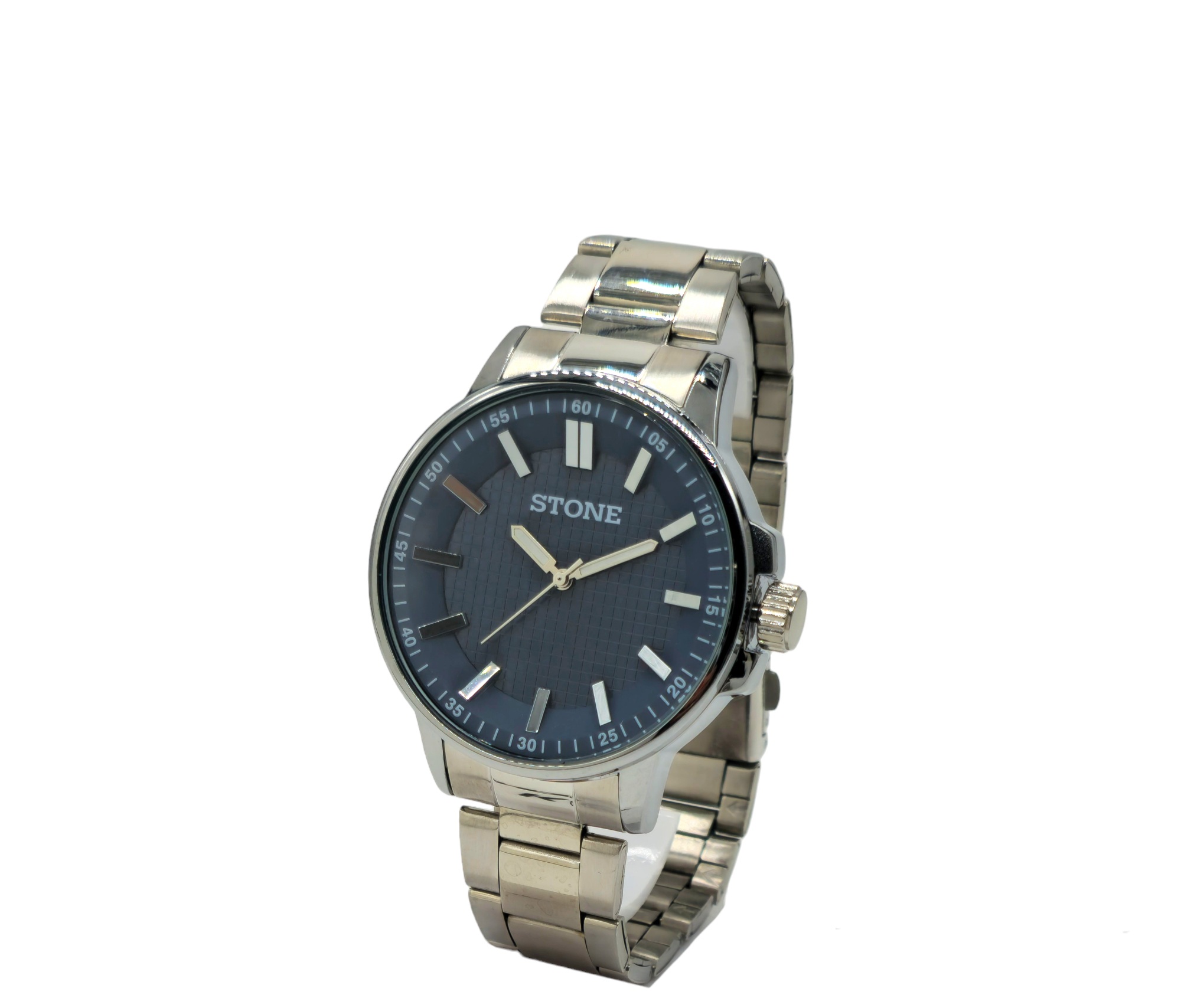 Reloj análogo con caja y malla de metal.